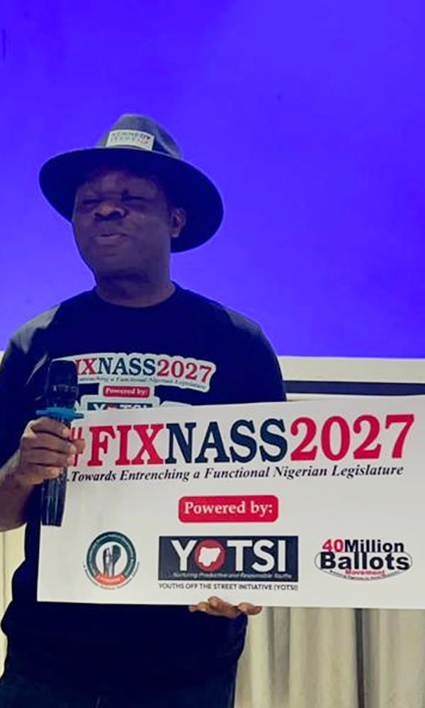 #FixNASS2027 is a political action movement anchored and driven by concerned citizens, including both ordinary Nigerians and the elites but coordinated by a coalition of NGOs, CSOs, FBOs and cooperative groups through the Youths Off The Street Initiative (YOTSI), 40Million Ballots Movement, and the Nigerian Youths and Women Political Emancipation Movement (NYWOPEM).